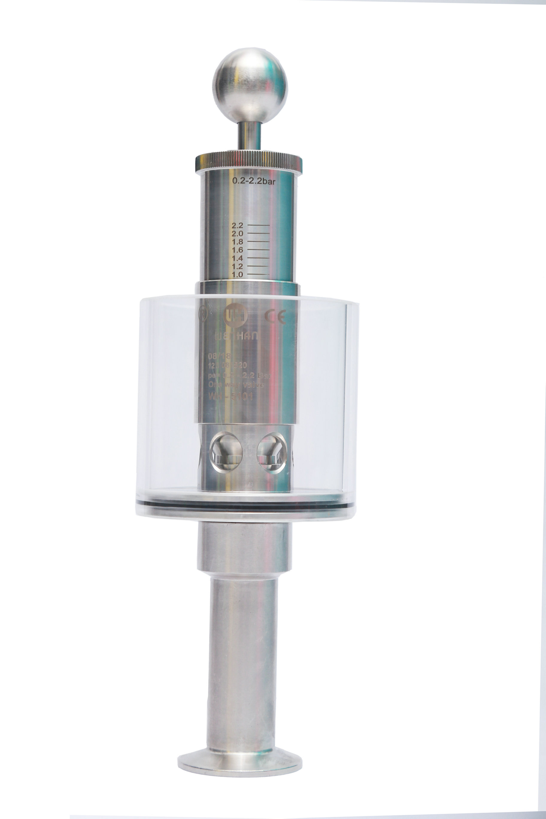 調(diào)節(jié)單向排氣閥保護(hù)容器壓力過高防爆作用,當(dāng)壓力高于設(shè)定壓力(標(biāo)準(zhǔn)1BAR)時可以排氣,反之關(guān)閉,調(diào)節(jié)桿標(biāo)上壓力刻度,所需壓力按刻度上調(diào)整,該閥門使用方便,刻度準(zhǔn)確,玻璃罩加水能看到發(fā)酵效果,減少染菌。同時也可以滿足于各種生產(chǎn)工藝需求,適用于各種食品加工,啤酒,飲料以及制藥等各種工業(yè)領(lǐng)域。
